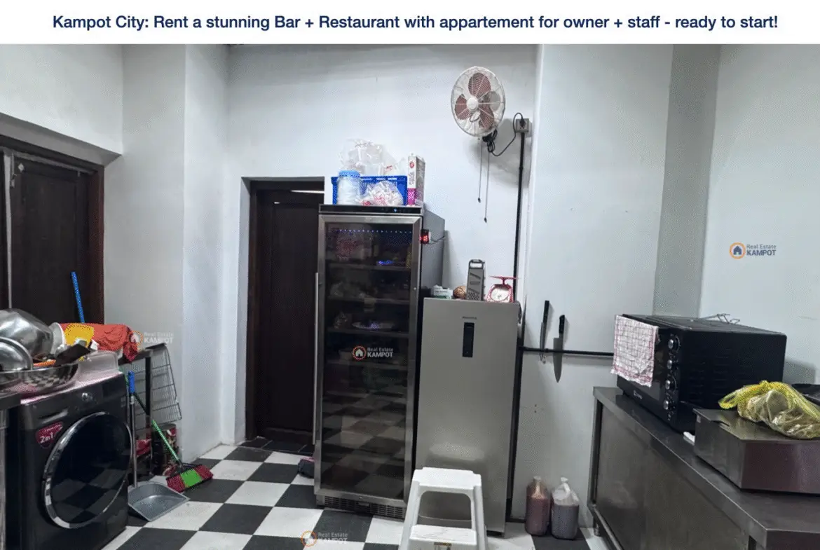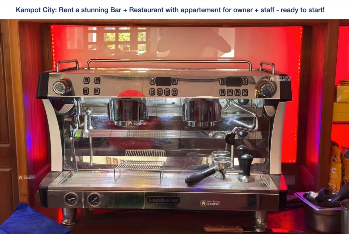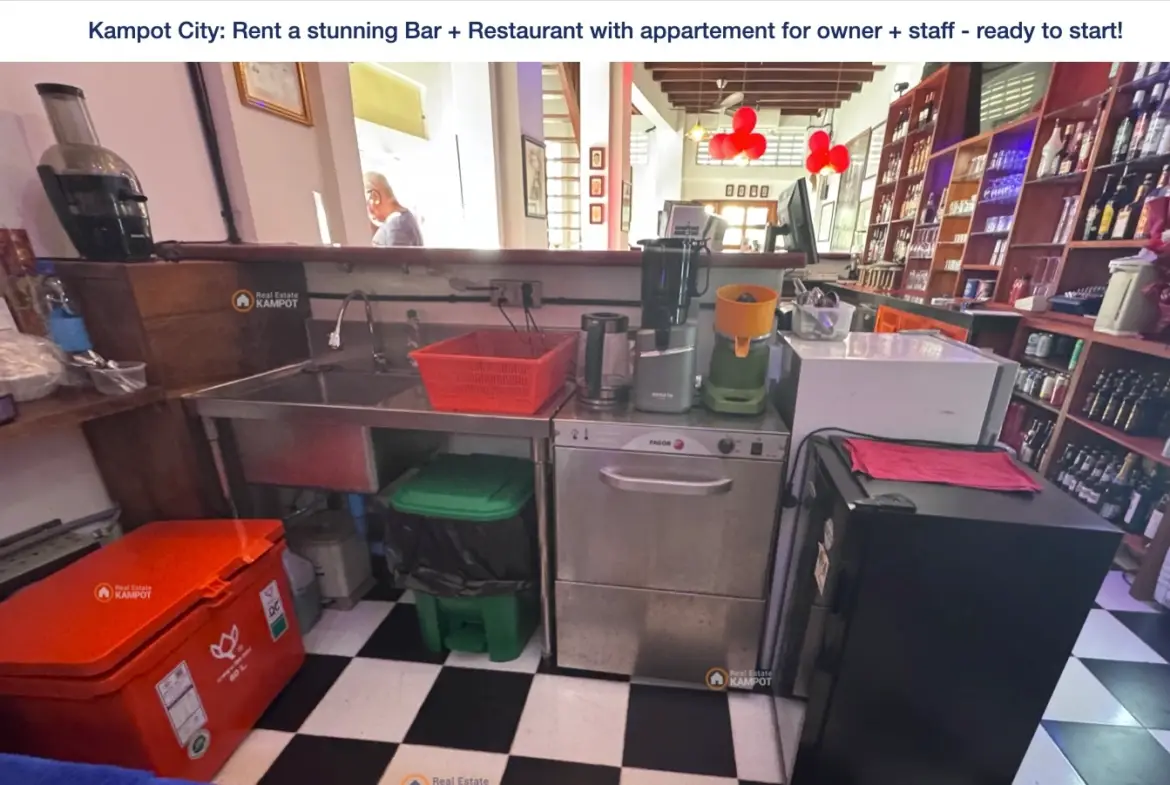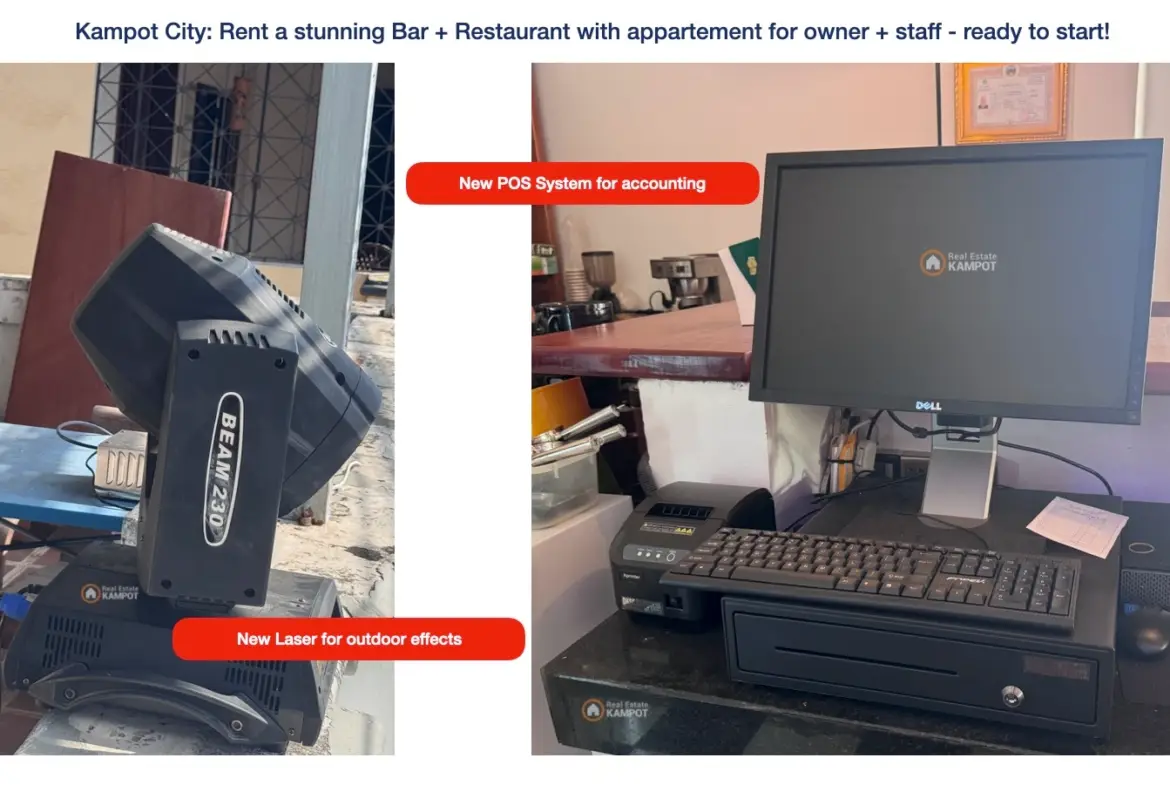 Rent a ready to start new business at the city of Kampot, directly at the favorite tourist area! The Restaurant an Bar has a really new high quality interieur, kitchen and all tools you need for a successful business.