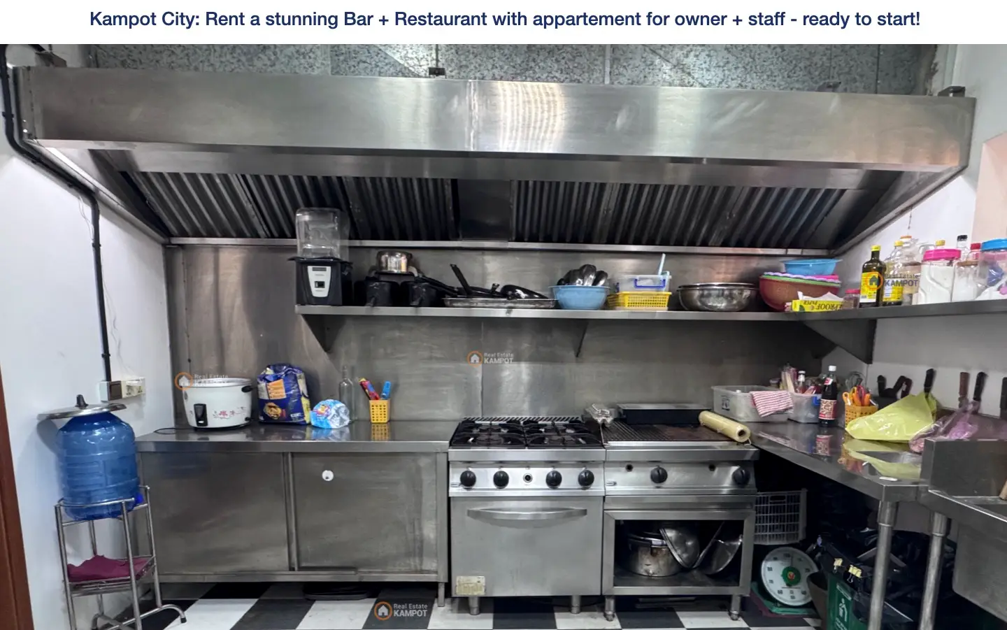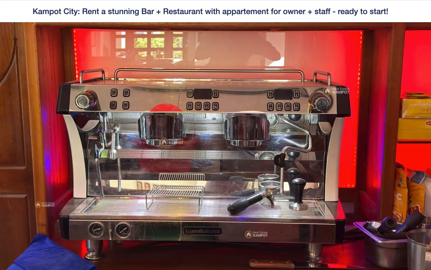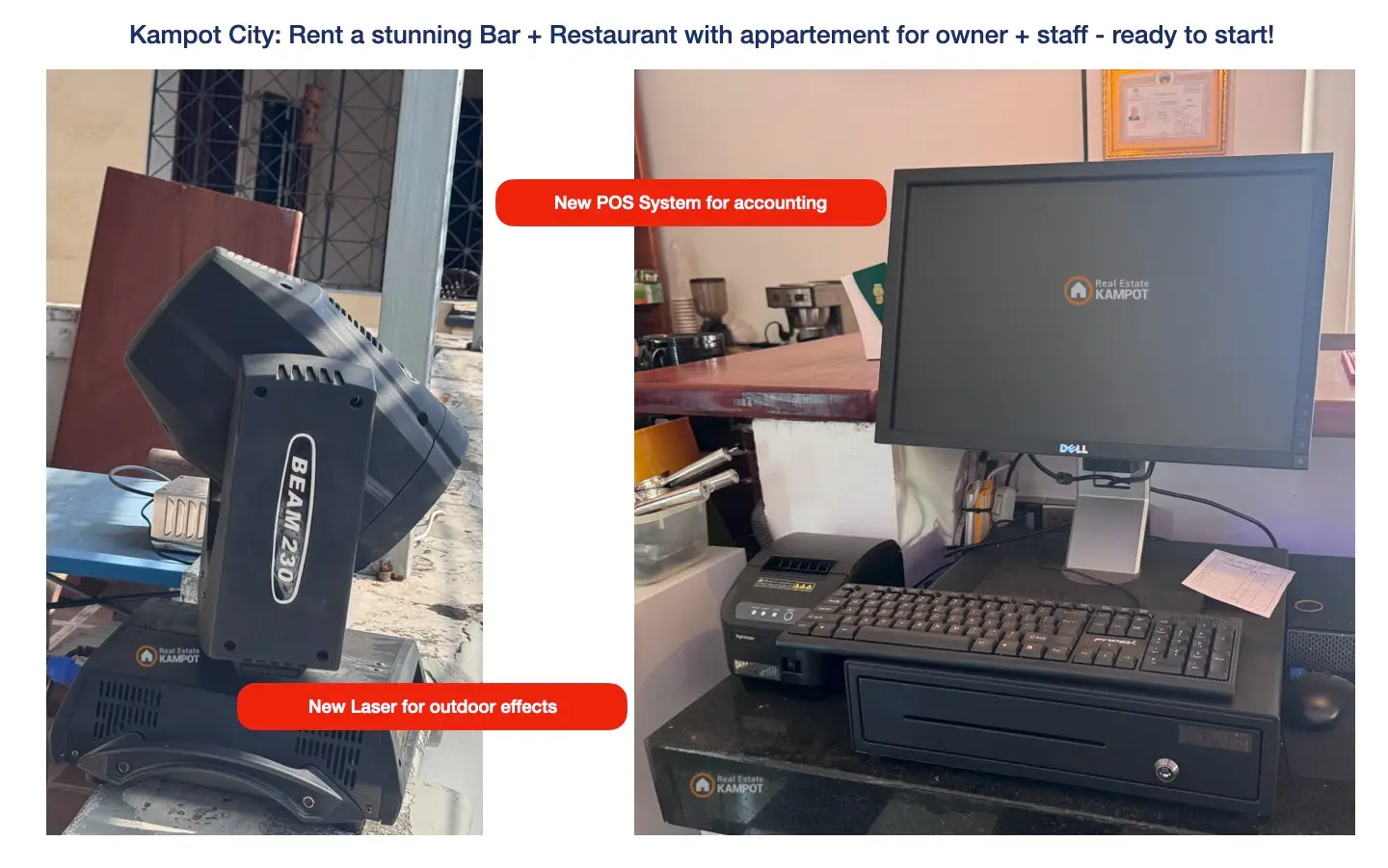 Rent a ready to start new business at the city of Kampot, directly at the favorite tourist area! The Restaurant an Bar has a really new high quality interieur, kitchen and all tools you need for a successful business.