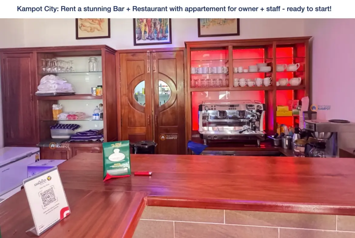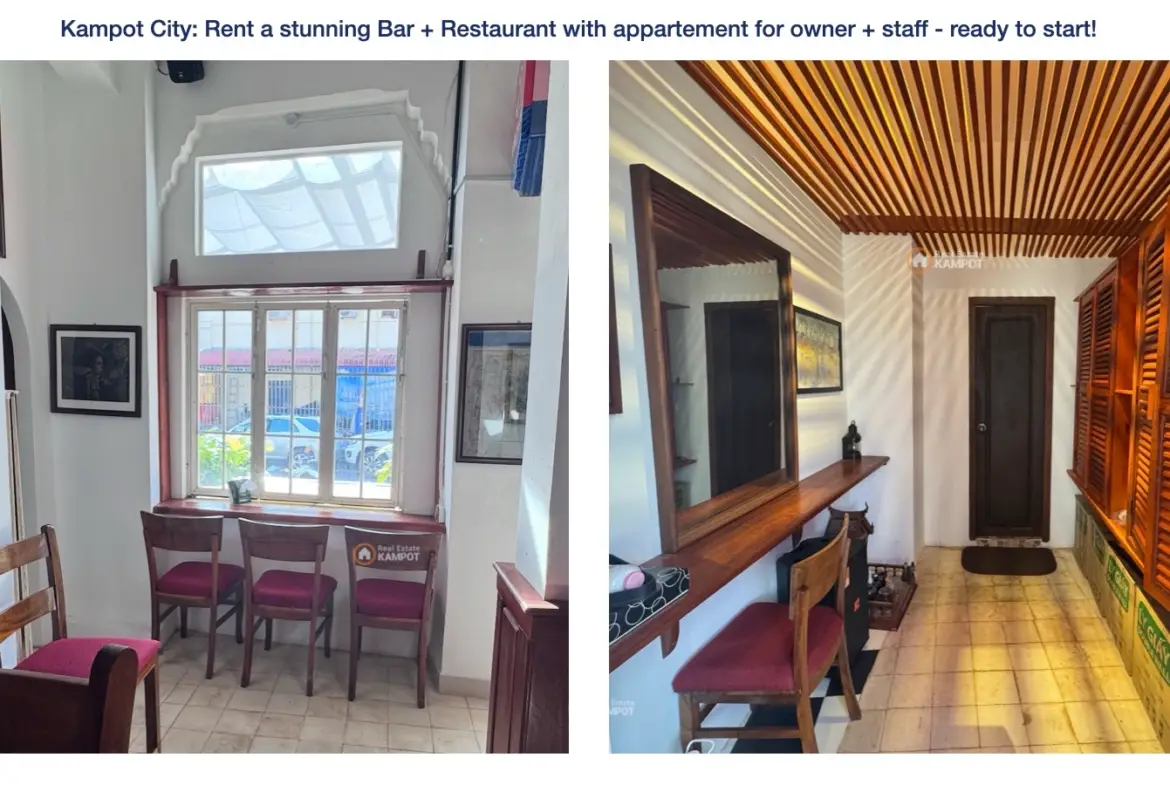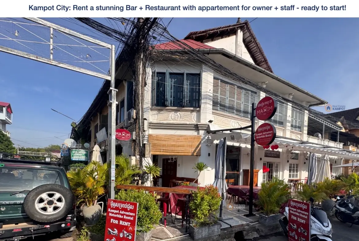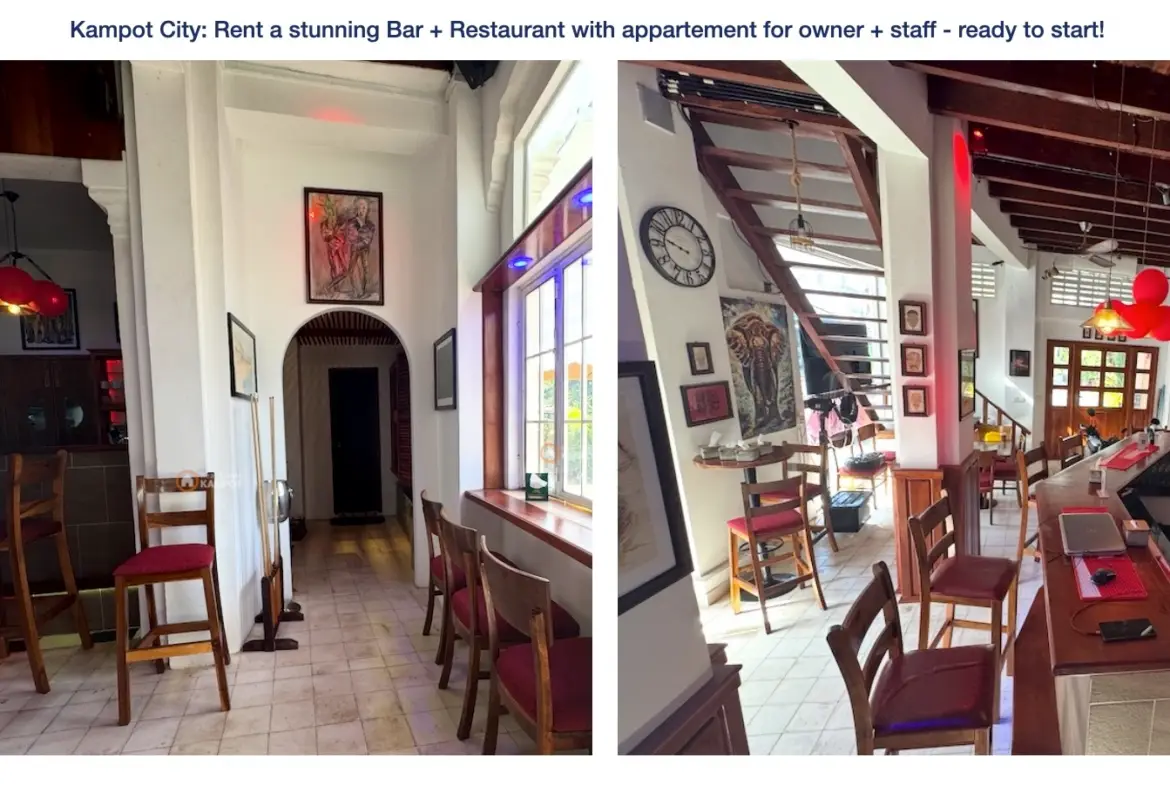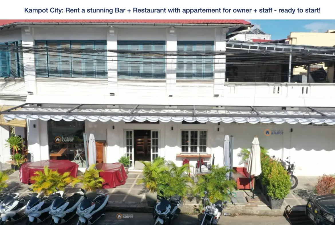 Kampot City: Rent a stunning Bar + Restaurant with appartement for owner + staff – ready to start!