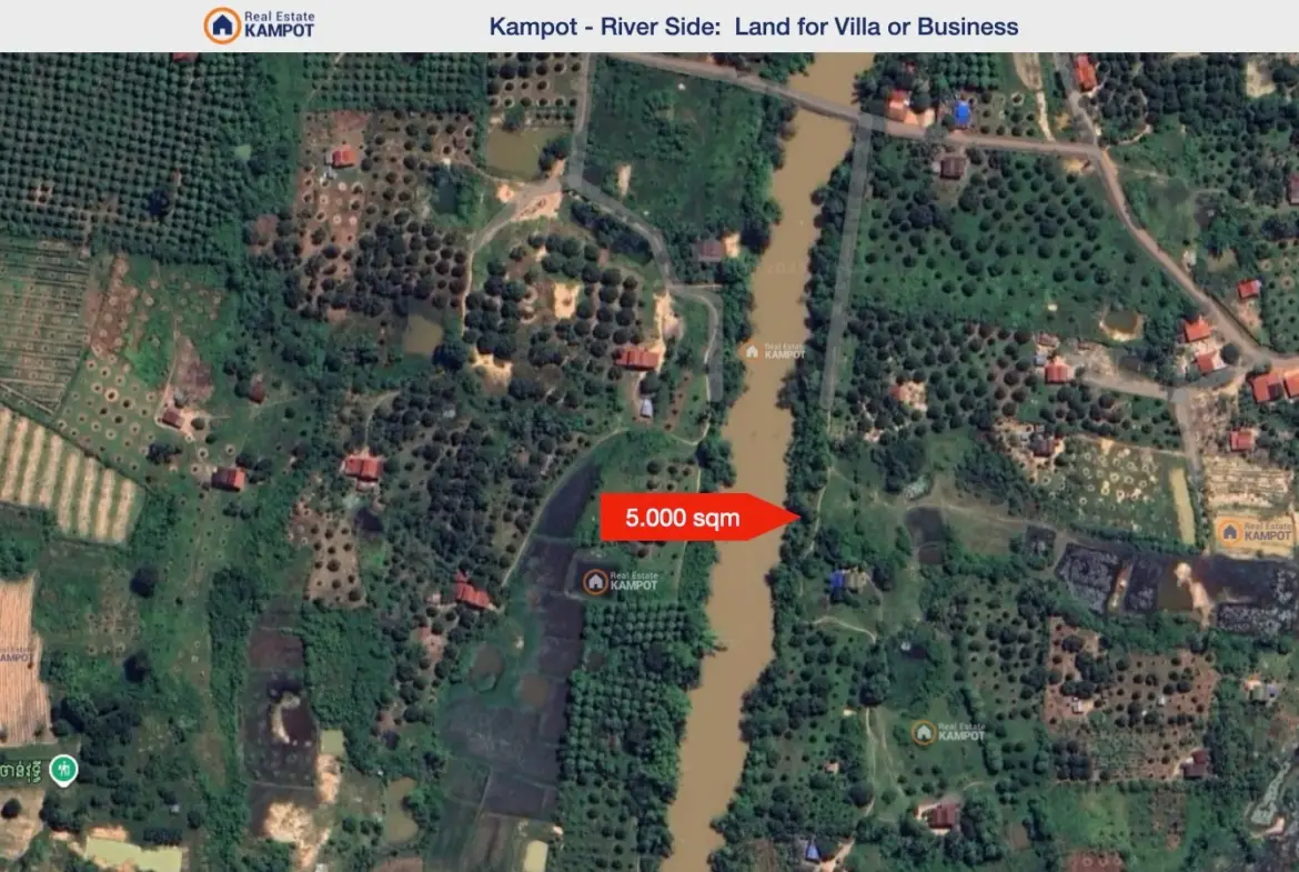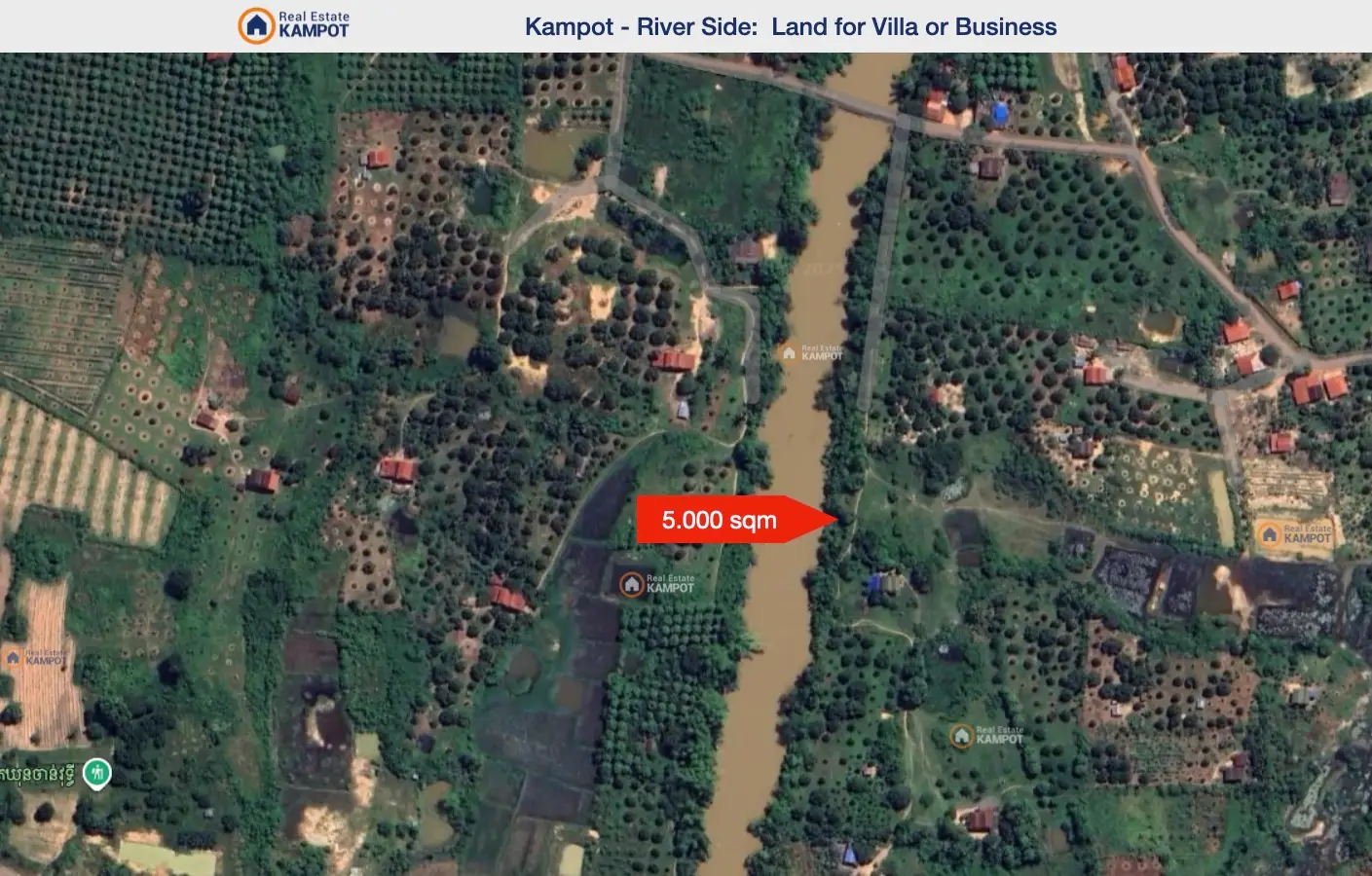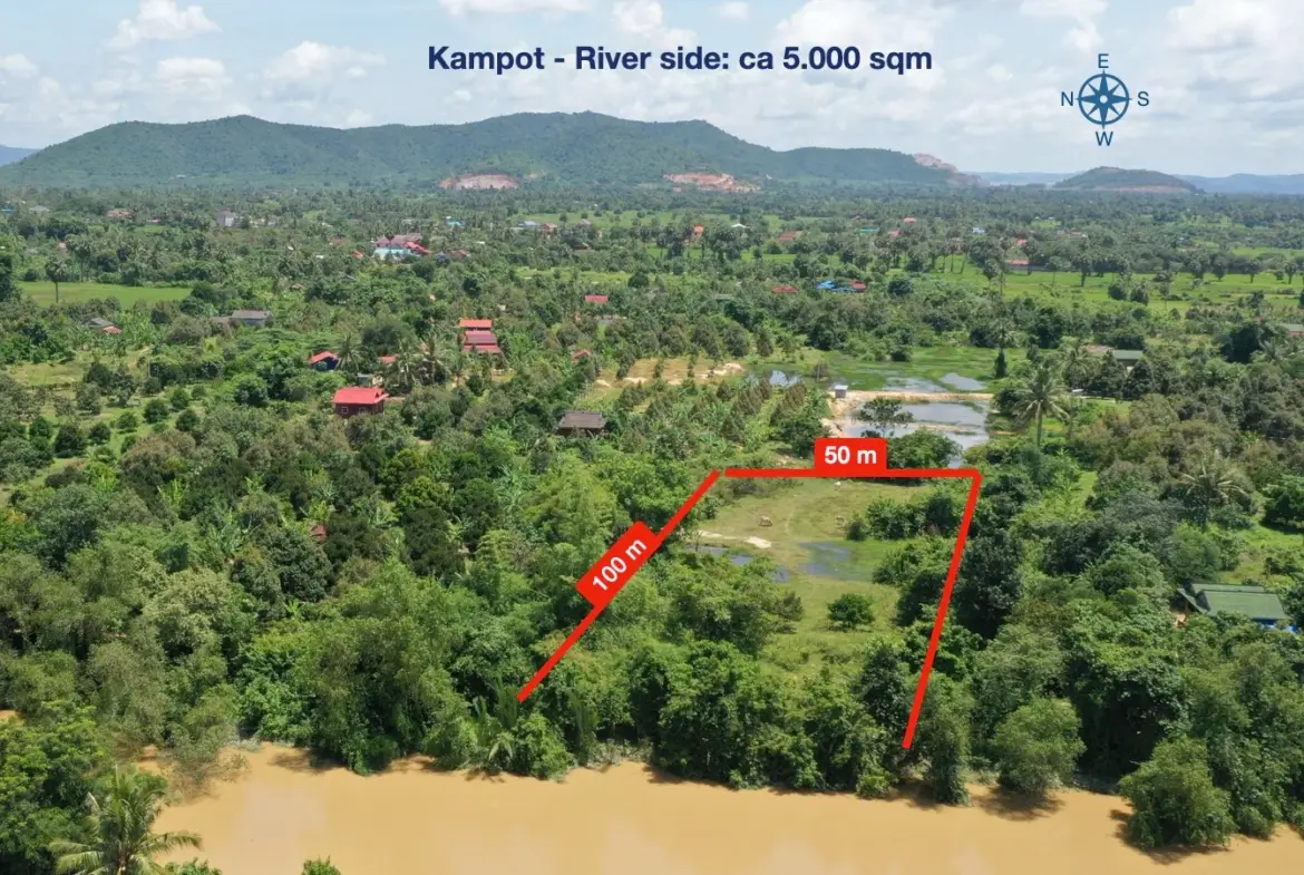 Amazing land for your home or business, directly at the river and less than 10 minutes from Sabay Beach Bridge. The land is filled and has a stunning view to the mountains of Bokor National Park.