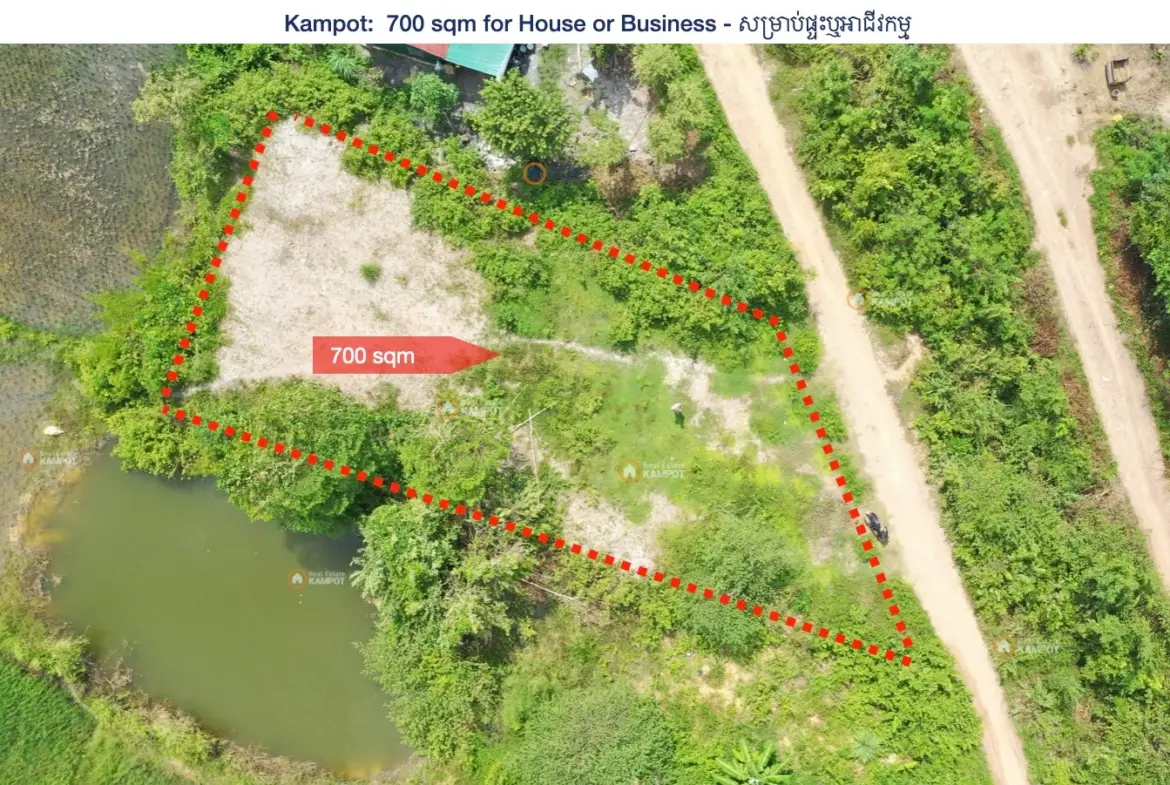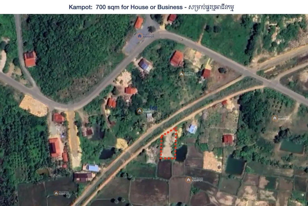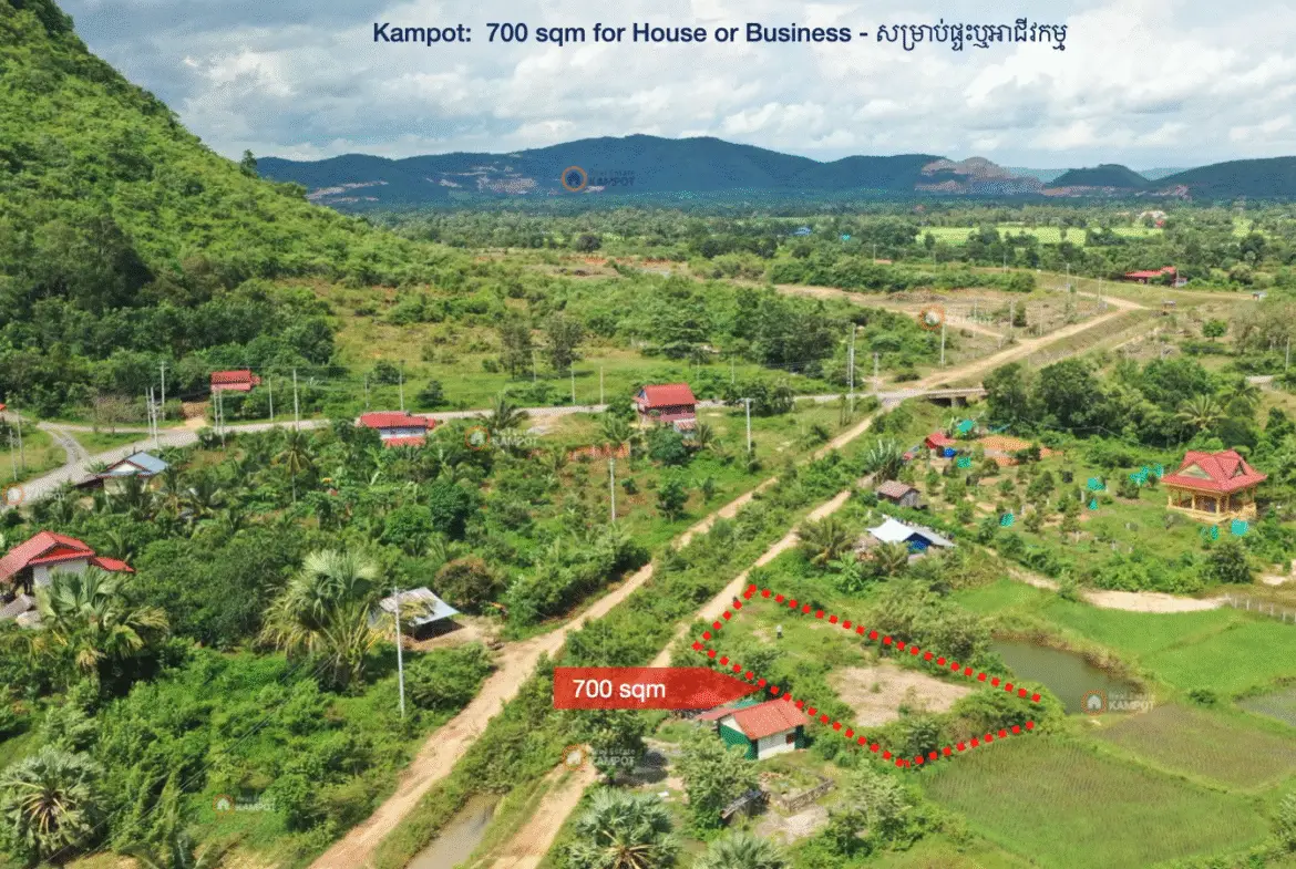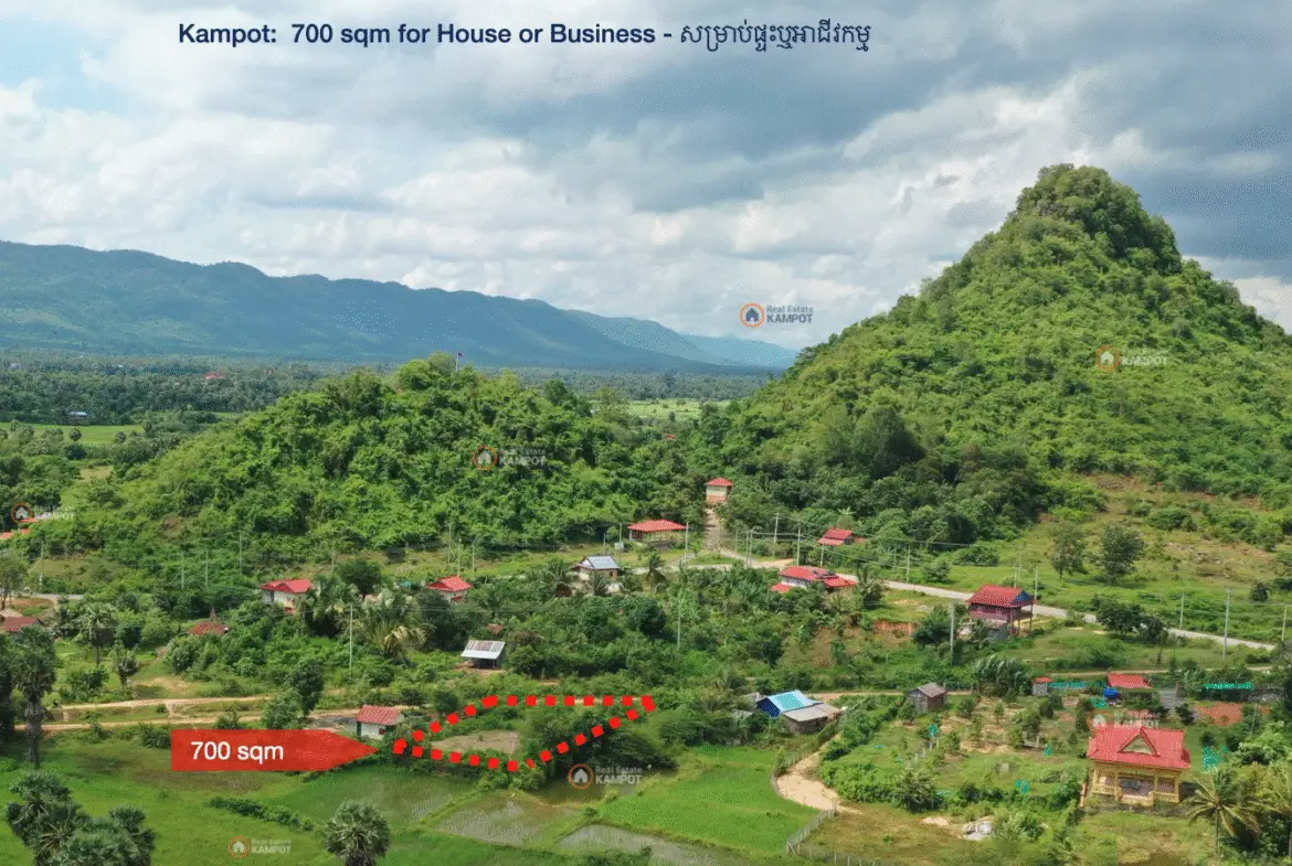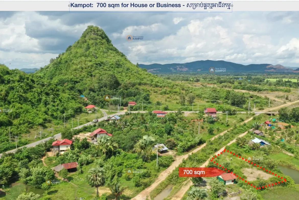 700 sqm of beautiful land, located directly on a white mountain with fantastic views of the Bokor Hill National Park. The property is filled and ready for development for a house or business.